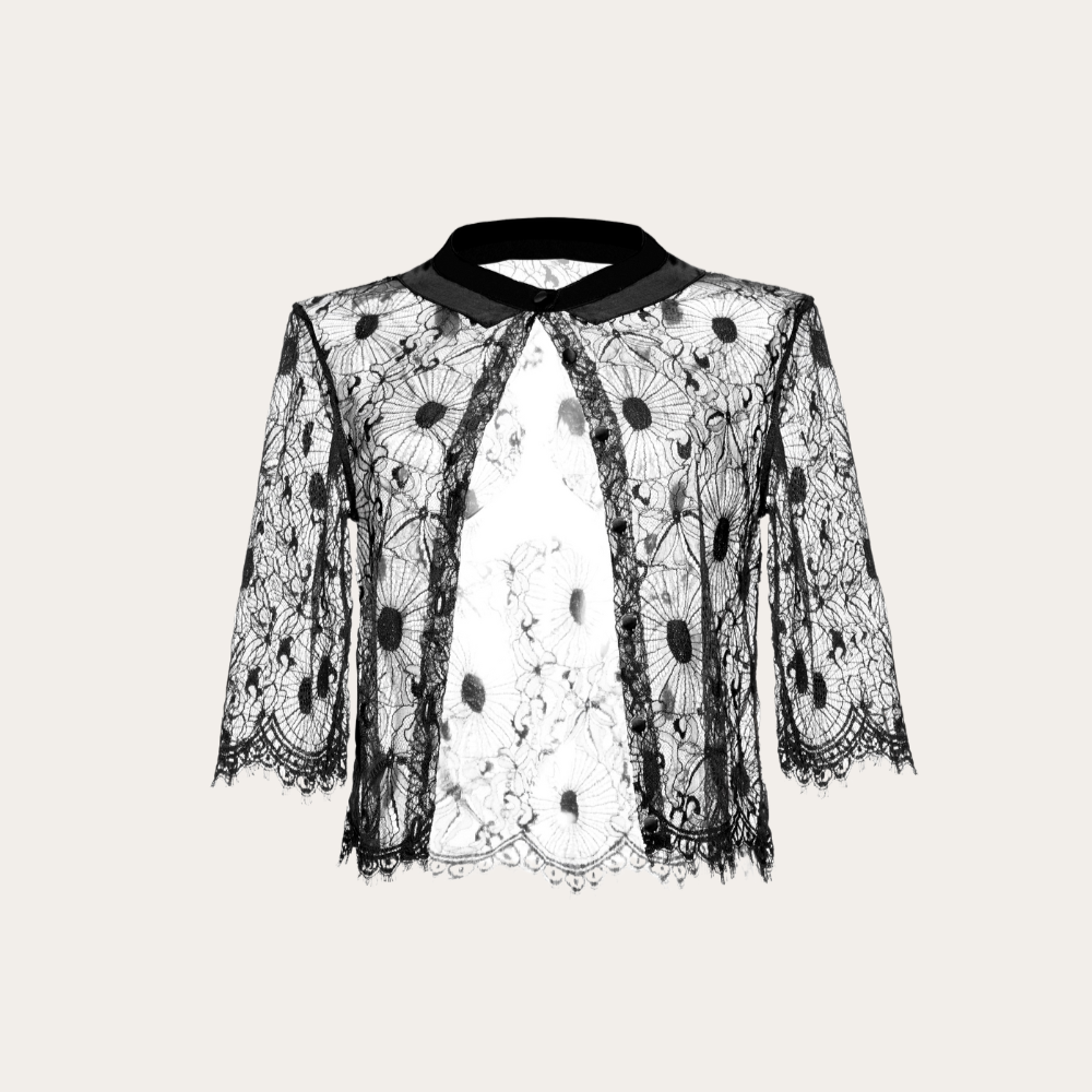 Petit chemisier qui se ferme par des boutons recouverts de soie noire, coordonnés à son petit col claudine. Dentelle française de Calais. Made in France.